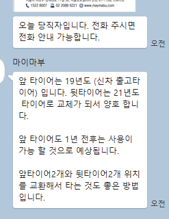 마이 마부 기사분께서 시간이 안나 바쁜 저를 대신해 꼼꼼히 잘 봐 주셨습니다. 평가 내용을 믿고 차를 계약 하였으며, 앞으로도 재 이용 의사는 무조건! 입니다. 신용의 값어치를 아시는 분이라면 이 서비스 비용이 아깝지 않을 것이라 생각합니다. 앞으로도 성업하시고 부디 신뢰를 잃지 않는 정직한 회사가...심** 2022.05.31 -